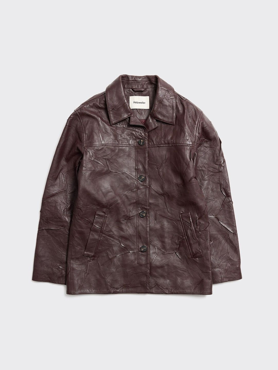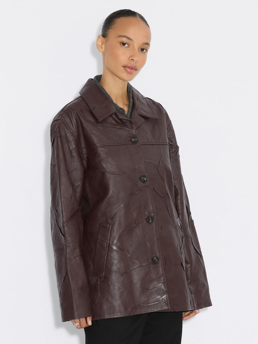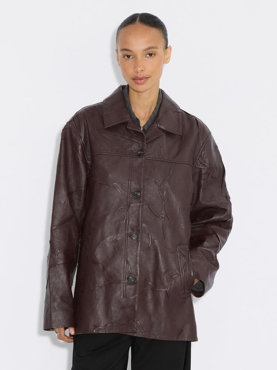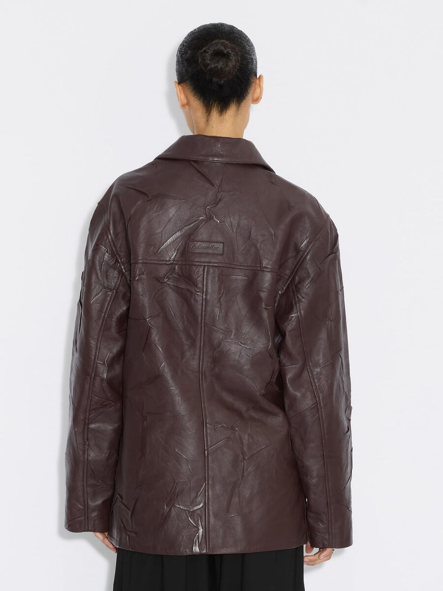 A leather jacket is integral to a timelessly sophisticated wardrobe; that’s where our investment-worthy, buttersoft Crinkle-Effect Leather Jacket comes in. The epitome of a forever piece, this jacket is a playful crinkled variation on the regular leather style. The layering staple has a sleek mid length with buttons to the front and logo and yoke detailing at the back. As well as a rich burgundy tone evoking luxury which will pair nicely with earthy palettes.