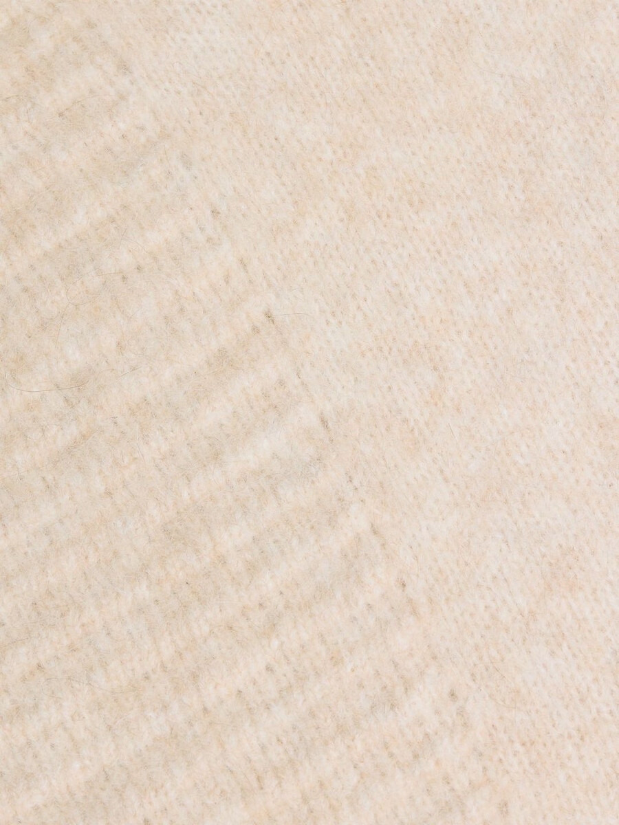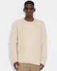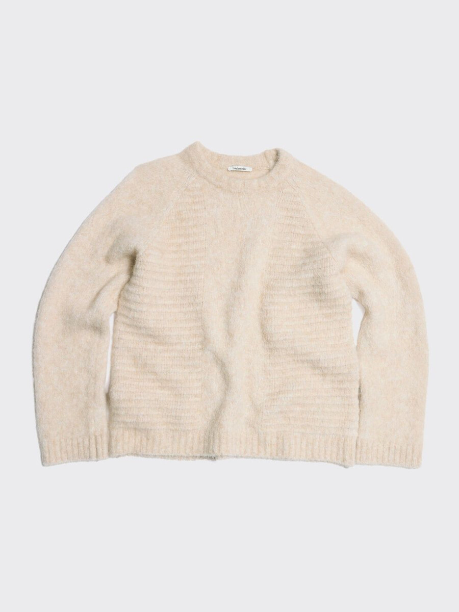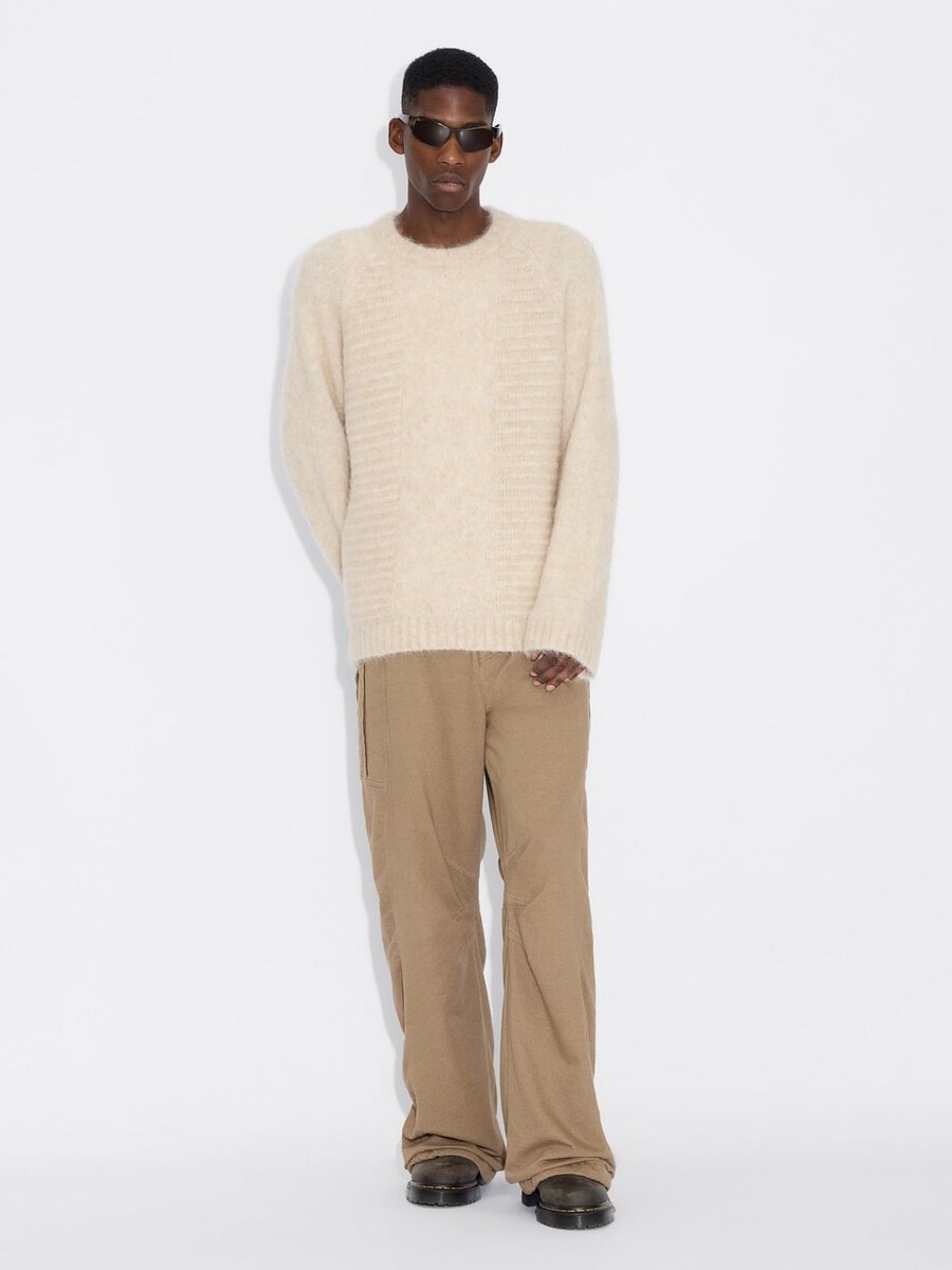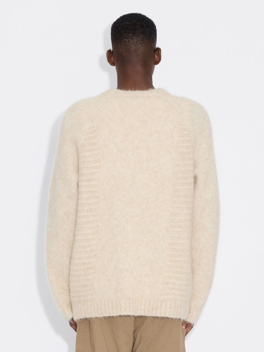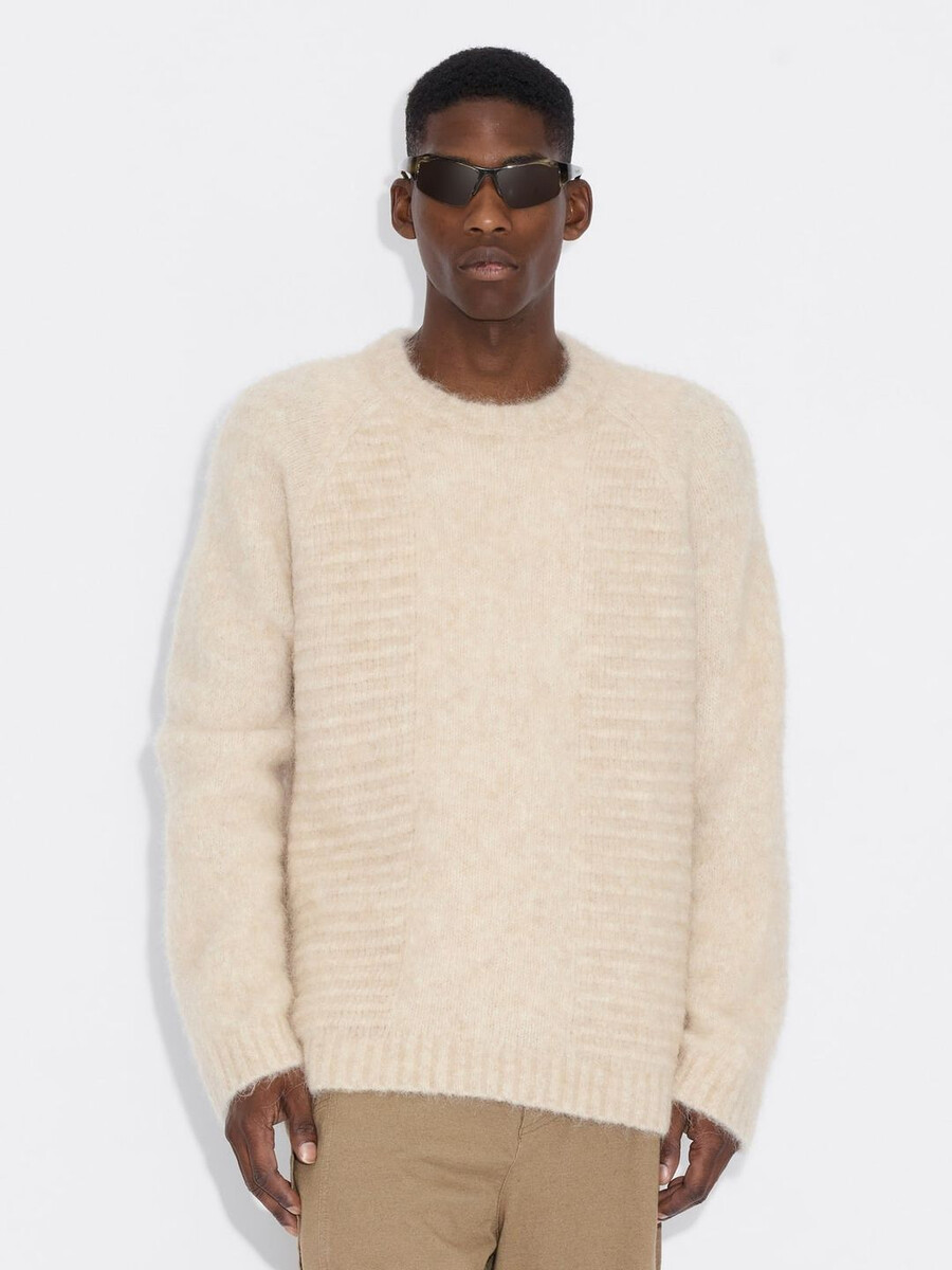 The Data sweater is made from a soft alpaca-blend knit. It’s a boxy design that showcases a range of separate knitting techniques and patterns, and it features fitted cuff sleeves.