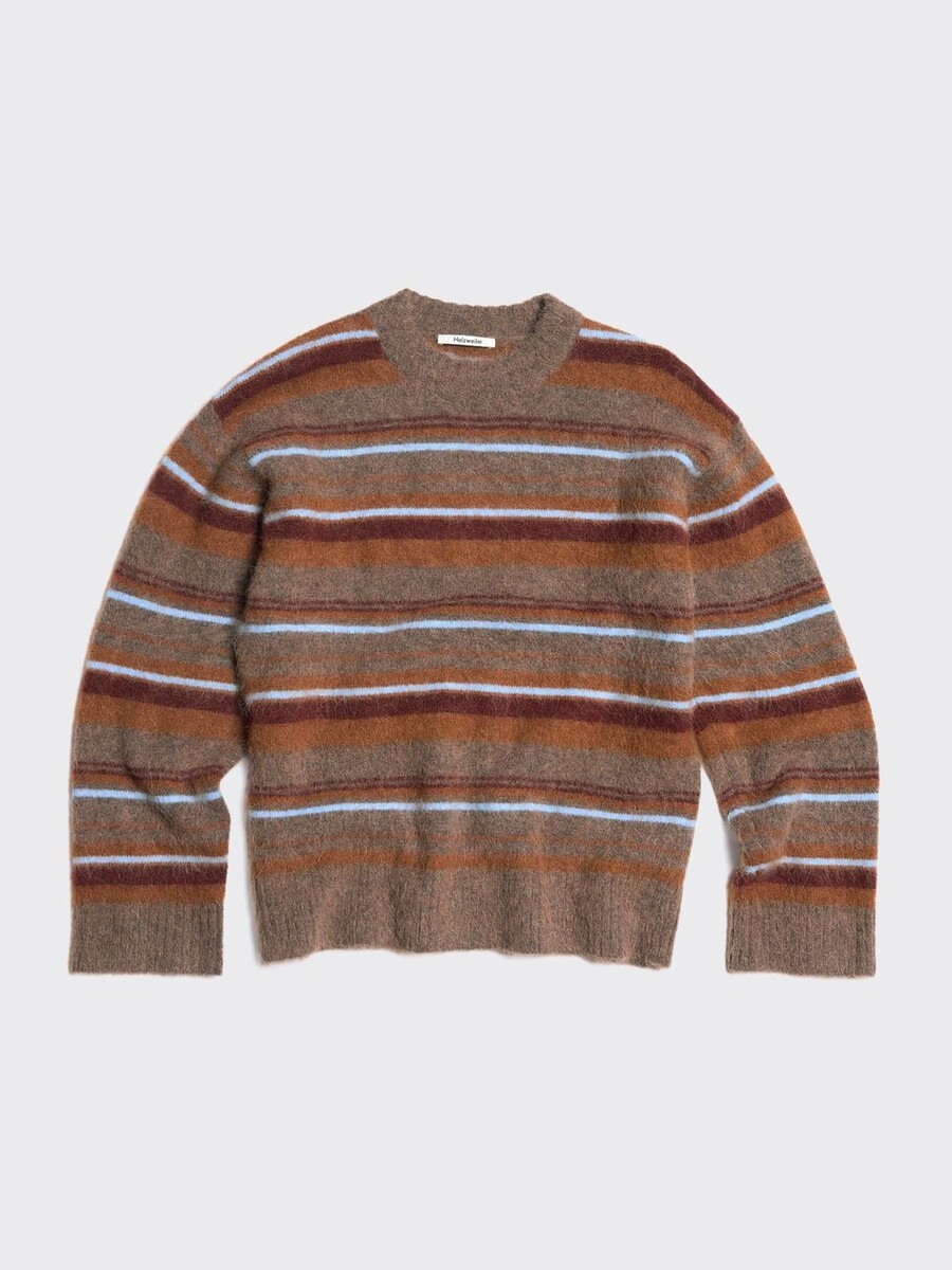 The Fluffy Stripe sweater is made from a tactile alpaca-blend knit with horizontal stripes. A classic silhouette, it has raglan sleeves, a crew neck, insulating ribbed edges and a relaxed fit.