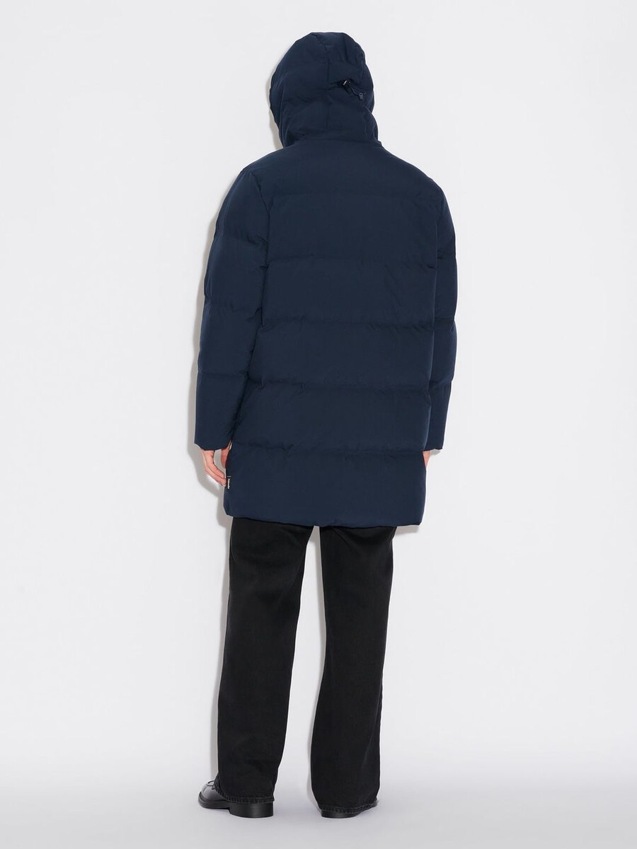 Padded with RDS-certified down and made from a responsibly sourced technical fabric with 10K/10K Waterproof DWR finishing, the Lom Down jacket will prove indispensible to your outerwear rotation in the colder months. A knee-length design with a straight-down silhouette, it has a hood, funnel neck and a front zip fastening with a protective placket