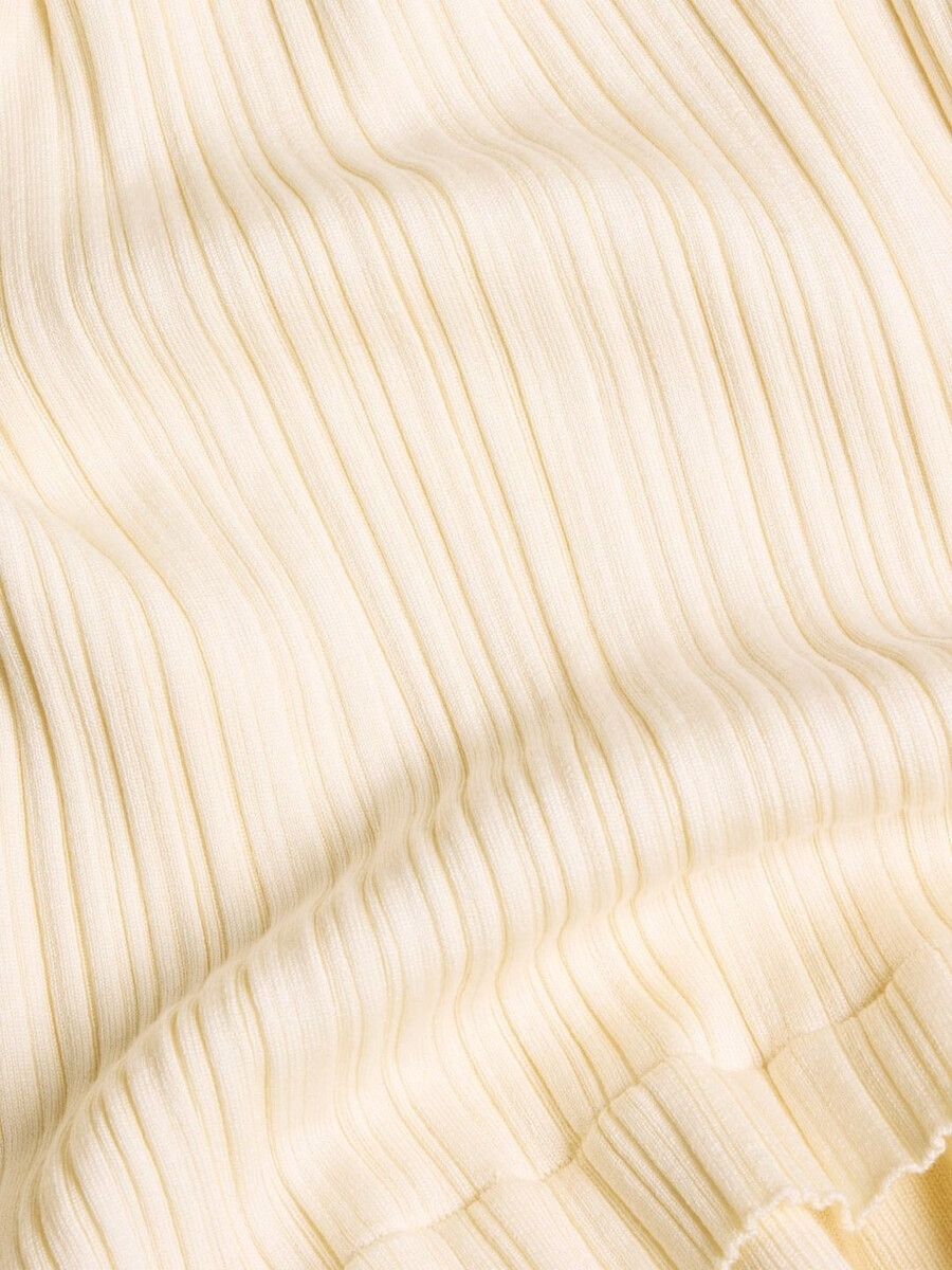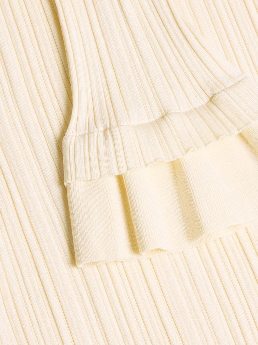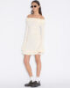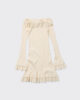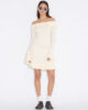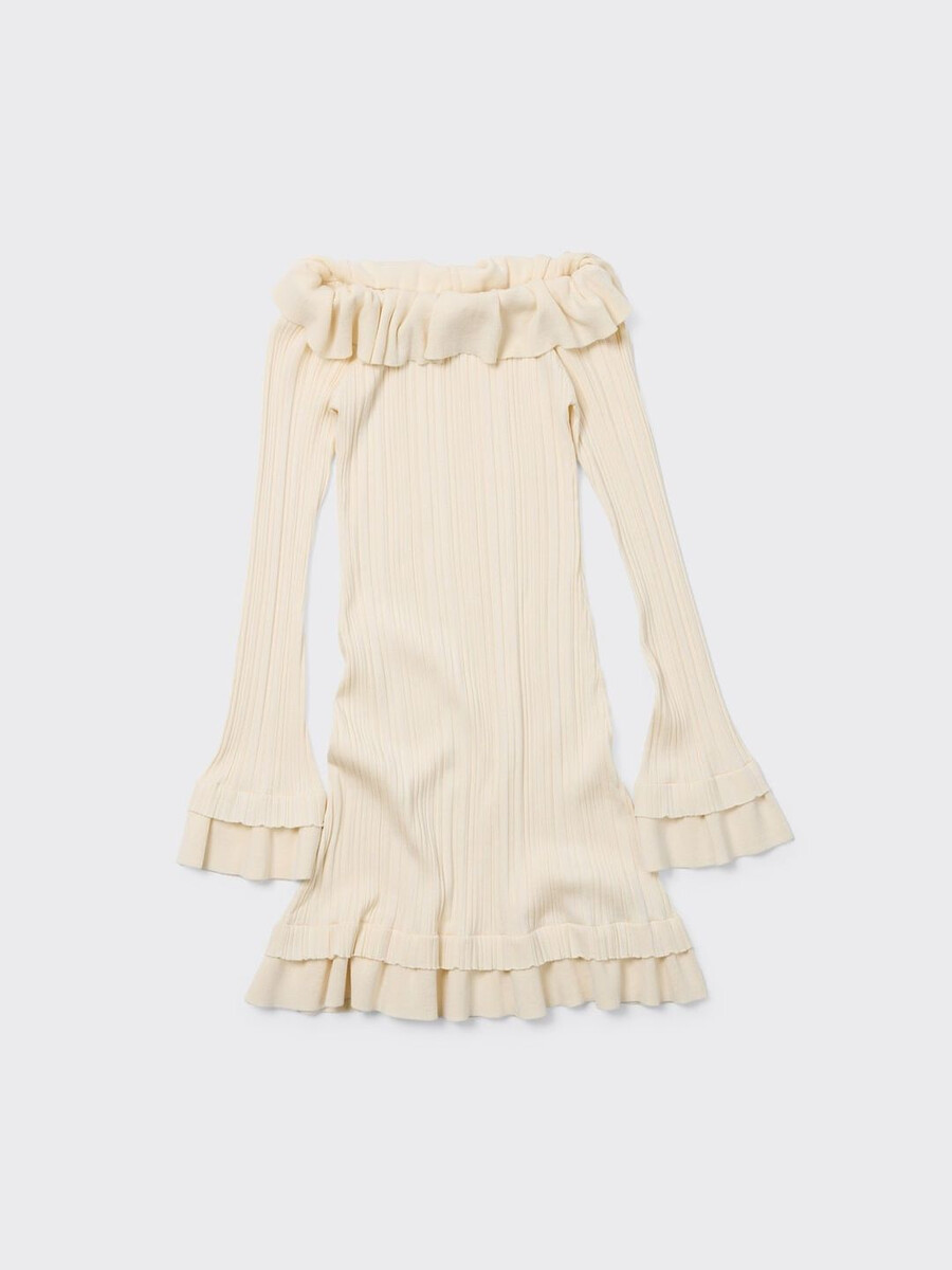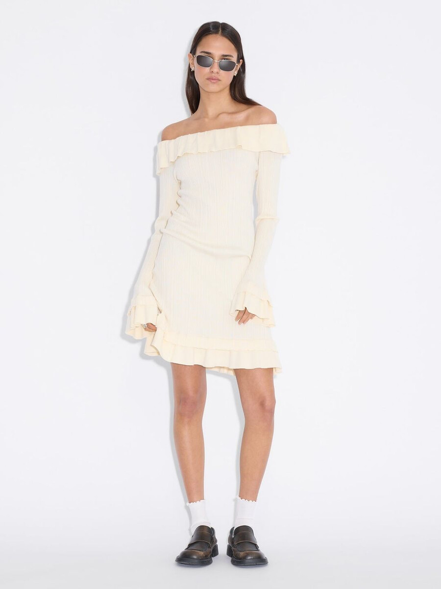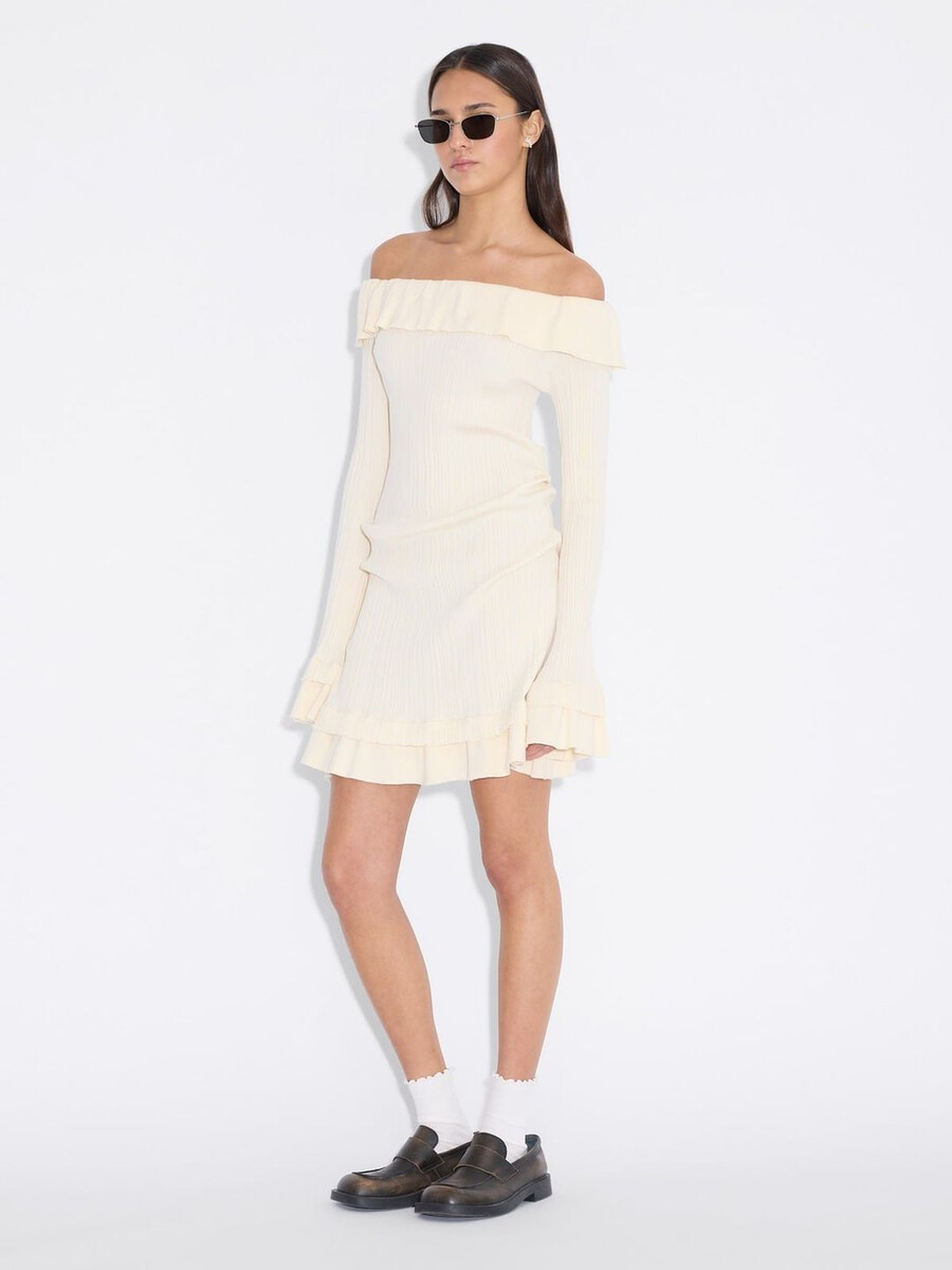 Made from a stretchy ribbed-knit, the Ripple dress has an off-shoulder silhouette. It’s a layered construction with a double mini-length hem, and it features elongated sleeves.